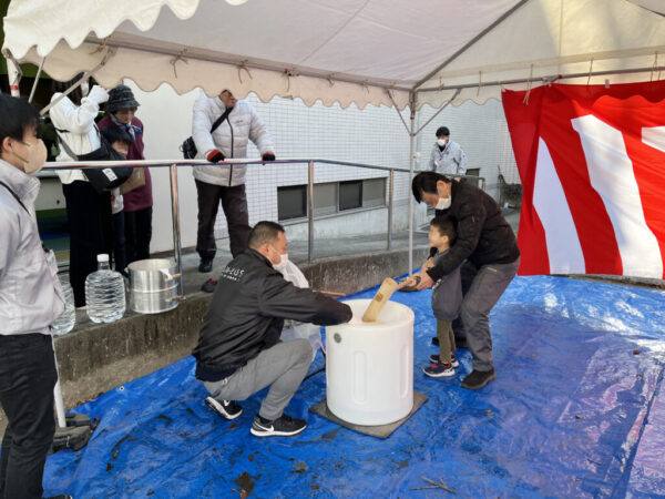 お子さまからご年配の方まで、たくさんの方が順番に杵を持ち、一緒にお餅をついて楽しみました。