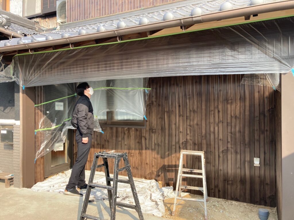 この日は、塗装工事を行っている現場の確認に先輩社員と一緒に向かいました。実際に職人さんの作業を間近で見たり、先輩社員がどのように現場をチェックしているのかを学ぶ機会となりました。