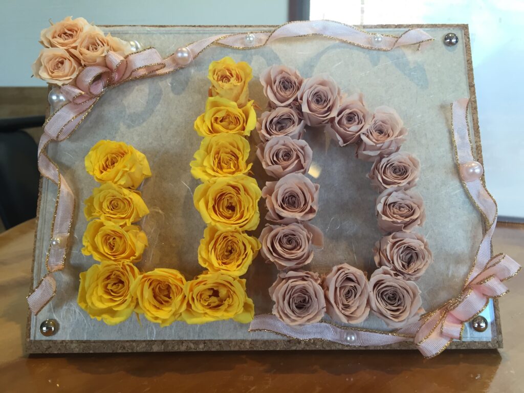 プリザーブドフラワーのバラが形どっているのは、ウオハシの会社ロゴ!